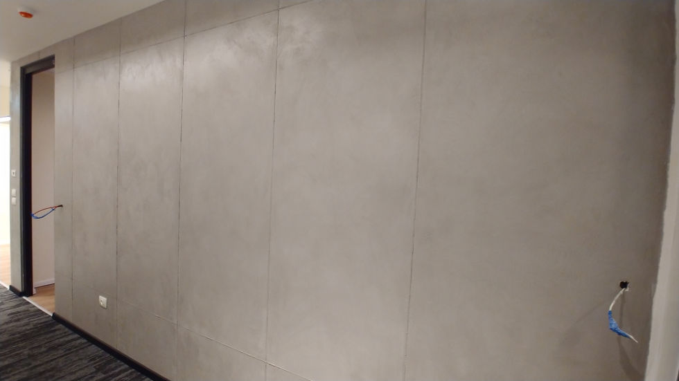יישום מערכת בטון אדריכלי מיקרוטופינג על גבי תשתית גבס בטקסטורת פירוק טפסות אריחי בטון במידות 200/80